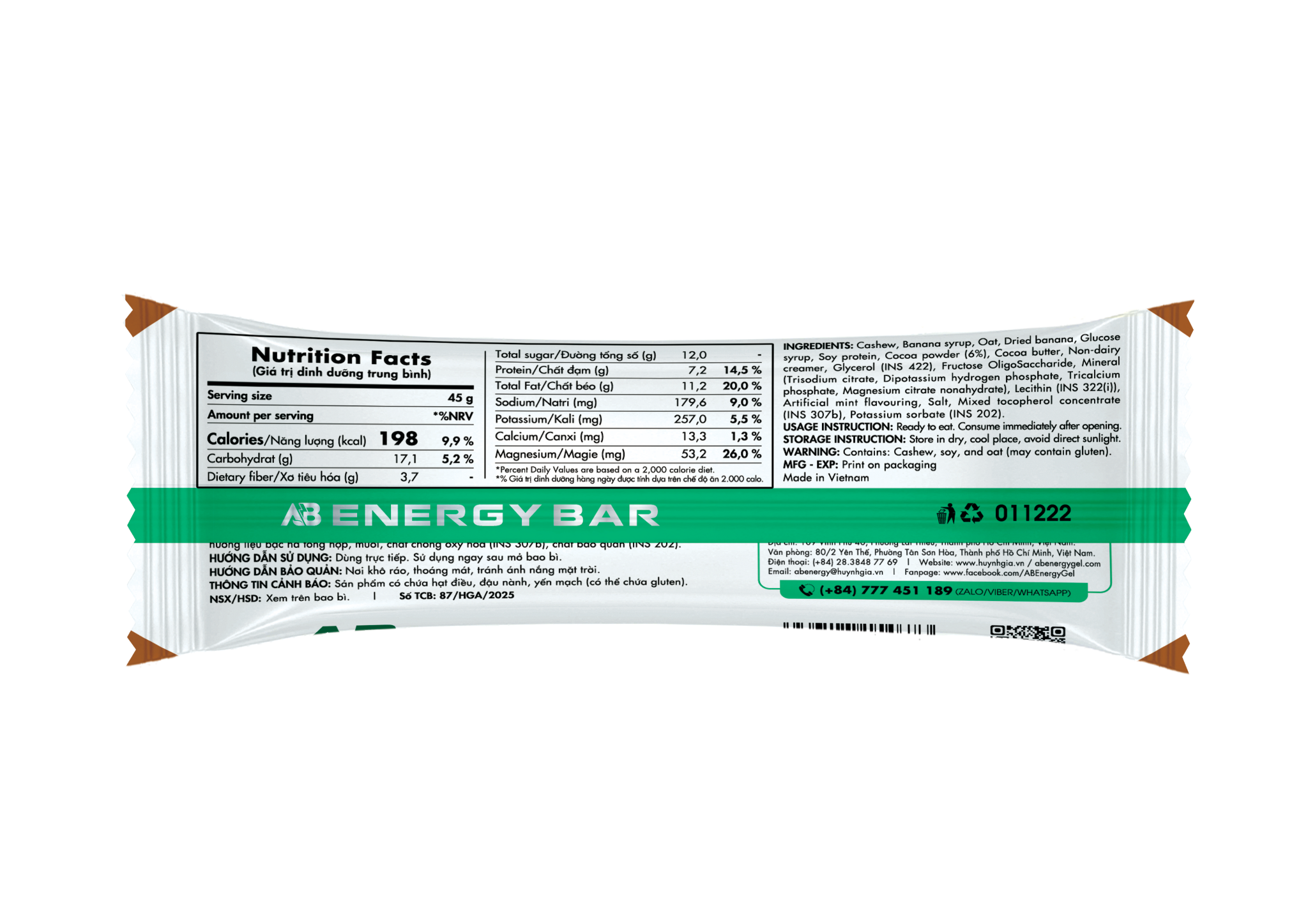AB Energy Bar – Cocoa Mint là phiên bản thanh năng lượng đậm vị ca cao nguyên chất hòa quyện cùng bạc hà mát lạnh, mang lại cảm giác tỉnh táo và sảng khoái trong suốt quá trình vận động. Sản phẩm được nghiên cứu và phát triển dành cho người yêu thể thao, cần nạp năng lượng nhanh – gọn – lành mạnh trước, trong hoặc sau khi vận động.